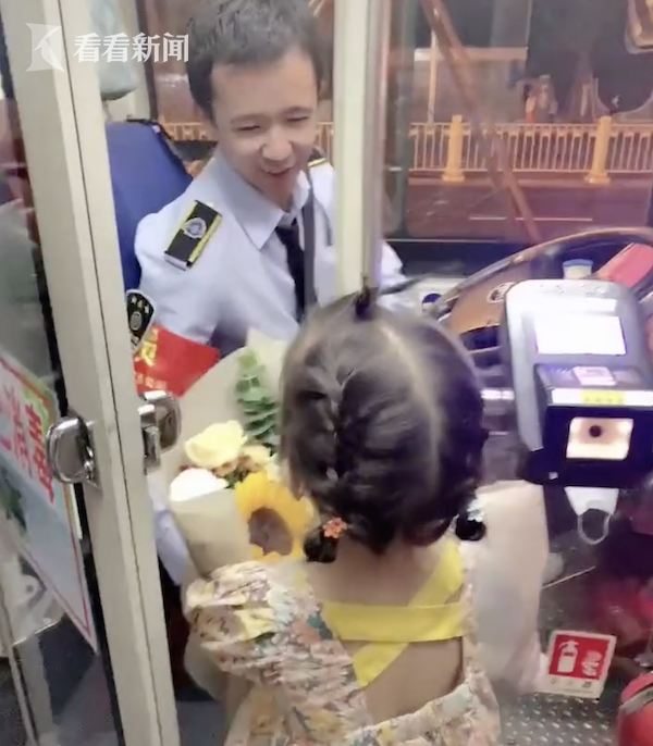父亲节,3岁女儿等在终点站给司机爸爸送花