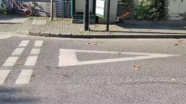 • 4、倒三角路口减速标线 倒三角路口减速标线,用来提醒驾驶员,前方是路口,必须减速慢行,会车时要让主干道的车辆先行。