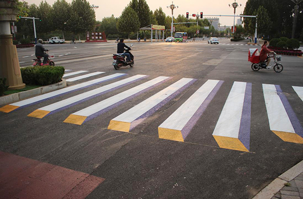 • 3、彩色三维立体人行道标线 这种标线非常好认,在传统的人行道标线上加入了三维立体图案,给过往的驾驶员以非常强烈的视觉冲击效果,具有很好的提示作用。