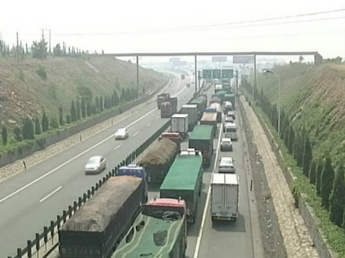 ![]() ![]() 车辆在高速排长队。 ![]() 堵车队伍中以货车居多。 2010年6月22日央视《经济半小时》播出《京张高速“堵”在哪里?》,以下是节目实录: 连接北京和张家口的京张高速公路,从6月2号开始,发生了今年以来规模最大的一次堵车,最严重的时候,数千辆大货车首尾相接,车龙绵延数十公里,河北宣化到北京北六环一百多公里的路,要走上整整两天。这场大堵车已经持续了20天时间,京张高速的交通有没有得到改善呢? 6月11号,在京张高速位于河北境内的客货分流点记者看到,大量开往北京的货车在分流点前排起了长龙,无论是向进京方向、还是向出京方向看去,这条长龙都一眼望不到头。在交警的疏导之下,偶尔会有一些车辆缓慢行进一段距离,但不久之后就会再次寸步难行。 货车司机:原来去北京就是两天时间,从大同,现在要四五天。 堵在京张高速上的这些货车绝大多数是来自内蒙和山西的运煤车,货车司机告诉记者,从进入张家口境内开始,他们的车速就骤然下降,往往几个小时下来还开不了几公里。从张家口到北京短短100多公里的路程,正常情况下只需两个小时,但现在有很多人已经走了两天。堵在高速上,司机们只能靠附近村民们售卖的方便面充饥。 货车司机:上火,吃不好睡不好的。 在分流点,记者见到了河北省公安厅高速公路交警总队六支队支队长李义山,他告诉记者,从堵车开始那天算起,在长达10天的时间里,京张高速上平均每天滞留的车辆都有7000多辆,货车排起的长龙动辄就有五六十公里,最长时曾经达到70公里。这条所谓的高速公路几乎变成了一个巨大的停车场。 李义山(河北省公安厅高速公路交警总队六支队支队长):按照以往咱们正常通行情况下,百十公里的路段,最多是两个小时,现在我们这个京新现在大家看到,区区的20公里路段,有时候就要走20个小时,因此说这个进京的通行能力是受到了极大的限制。 李义山告诉记者,自从堵车发生之后,他所在的交警六支队每天出动60多部警车,120多名民警奋战在第一线,民警们平均每天工作18个小时以上,个别民警已经是48个小时没有下路。而就在李义山接受记者采访的时候,客货分流点的货车车道再一次被堵了个严严实实。 李义山:现在的分流大家可以看到已经是满了,因为啥,这是从北京一直连接到我们这条线的,这叫京新高速,这条高速呢,它是21公里的路段,现在我们往这边分流货车,现在21公里已经满了,使我们的分流点已经无处可分了,这种状况每天都要发生几次。 堵在高速上的货车形形色色,有运送煤炭的,有运送农产品的,也有运送生猪等畜产品的。运送煤炭的司机眼看一时半会车也动不了,索性睡起了大觉,但运送农产品和畜产品的司机就完全没这份心思了。由于天气炎热,这位司机担心生猪生病,还要时不时地爬上货车进行检查。随着堵车时间的延长,除了要面临动物生病或者货物腐败变质的风险,很多司机的运输成本也跟着增加不少。 货车司机:费用大约在6000多块,我们到天津、唐山,堵得话得8000到一万块。 面临大规模堵车状况的绝不仅仅是北京和张家口的交界处,而是已经一路堵到了张家口市区。在张家口市宣化县的京张高速入口处,指示牌上写着“进行方向车流量大”和“京张高速公路拥堵,货车请绕行110国道”,而在离指示牌不远处就排着长达30多公里的货车,为了缓解京张高速的通行压力,当地的交警全员出动,对货车进行限流。 冯志龙(河北省张家口市宣化县交警大队副大队长):只能卡在这,再走整个堵死了,整个瘫痪了就。现在的措施就是,我们听高速(交警)的,高速(交警)说可以放车了,我们这边就可以流通一部分,他们说不行了,我们再卡住。 运煤司机小姜来自内蒙呼和浩特,他告诉记者,常年从西北往北京方向跑车的司机,提到京张高速,没有一个不头疼的。 货车司机小姜:天天堵,天天堵。哎呀,比低速还有点慢,讲实话,就跟蜗牛在上面爬那么慢,一天走了几里地。 就在这个路口,小姜已经整整等待了一天时间,还没有等到高速放行的信号。他告诉记者,这次拉货出来,他花费的时间是正常情况下的四倍。 记者:从呼和浩特到这边用了多长时间? 货车司机小姜:4天了,4天4夜了。 记者:正常情况下? 货车司机小姜:一天一夜就到了。 在漫长的等待中,小姜就一直待在这个狭小的驾驶舱里,眼下张家口的气温动不动就有30多摄氏度,小姜驾驶的货车里连空调都没有安装,而装有空调的司机们又都不舍得增加油耗,炎热的天气,让货车司机们在等待的时间里更加难熬。 货车司机小姜:受不了没办法,前面车走不了,你也走不了这个东西。热的时候就下去车下面转一下这个,兜点凉风,在上面更热不是,车里面更热。 作为我国北部地区的一条重要公路,全长148公里、总投资30亿元。2002年11月全线通车。然而因为频频发生的堵车,这条高速却被人们称作造价30个亿的巨型停车场,如此拥挤的交通,给公路沿线地区到底带来了怎样的困扰? 今年6月份,京张高速大堵车发生之后,张家口和河北省的各大报纸几乎天天都有关于京张高速的版面,而这样的情况对当地来说,早已是习以为常。张家口市交通局的一份报告提到,到了2005年,京张高速京冀交界处就已基本处于常年半瘫痪状态。堵车最严重时从北京河北交界一直堵到张家口西,长达130多公里,受堵车辆3万辆,滞留人员近10万人,持续时间长达34天。大动脉频繁梗阻,张家口