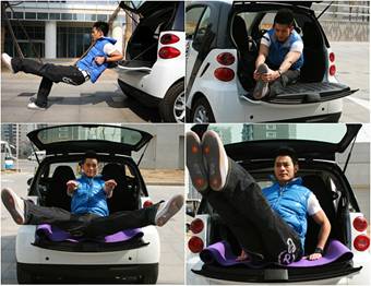 除了胸肌的练习,还可以脚踩弹力绳的一端,进行肱二头肌的练习,可以每次开车前做几组练习,但要坚持才能有效果。 ![]() 逐渐加强力量,由弹力绳变为难度更大的拉力器,渐进式的进行,拥有性感的胳膊指日可待。 车里放上几个哑铃不会很占地方,但是随手就可以进行上肢的训练 别看车身小,smart的后背空间可大有文章,上肢热身完毕,可以在这里进行一些下肢的练习,放下挡板做手臂和胸肌的练习,坐进车内可以伸展腿部,加上手臂的配合可以慢慢尝试难度很高的平衡联系,十分挑战腹肌,之前没有相应练习的请自重。 POSE时间,没有专门的练习部位,不过没些肌肉也不敢出来秀秀,哈哈 女士时间。相比男士的生猛,女士的运动就十分舒缓,伸展和放松为主,有笑嘻嘻的小车相伴,心情先放松了一半 闭上眼睛,深呼吸,一根条绳就可以达到放松和伸展的目的了 舒展完毕,可以渐渐加强幅度更大的动作,几组上下浮动,对开车久了的女士来说是不错的选择。 ![]() 随手带的一个矿泉水瓶也可以派上用场,老话,热爱运动的人们不会受到任何限制。 ![]() 即使没有工具在身旁也没有关系,可以打开后门进行些瑜伽的练习啊。 两位主角终于有了“对手戏”的机会,互相帮助,不仅可以达到运动的效果,还会有不错的心情将伴随左右。男士做支撑,女士可以放心地作些力量练习。有男士的帮助,一些高难度的动作也可以在协助下顺利完成。 虽然smart小巧的外表下竟会有这样的大肚腩已经让人惊诧,但再大的肚腩再多的动作也还只能车内缓解疲劳之用,赶快开着同样好动的smart找片空地下来疯跑一番吧。 |