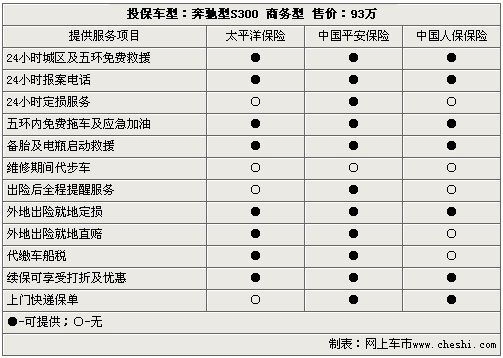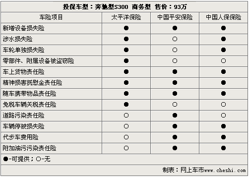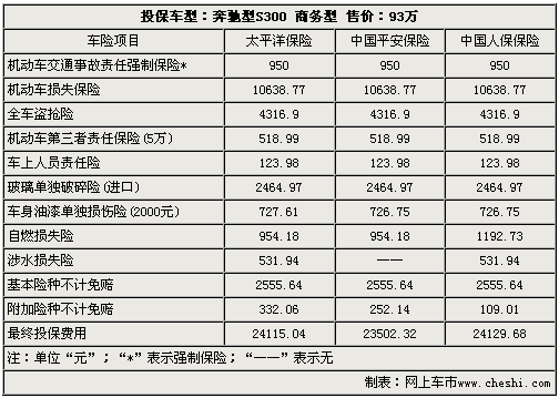 奔驰新S级轿车继上海车展全球首发后已于日前正式上市,全系8款车型售价为93万元-259.8万元。那么在购买奔驰新S级轿车后,其保险又将如何选择呢?下面我们将北京地区太平洋(601099,股吧)、平安、中保三家保险公司对奔驰新S级轿车入门车型的投保费用进行详实解析,以便为您购车提供一定的参考。