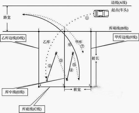 通过要求:考试时,从起点倒入乙库底部停正,再二进二退移位到甲库停正。接着前进穿过乙库至路上停正,再倒车进甲库中部停正。最后从甲库出库到起点停正。