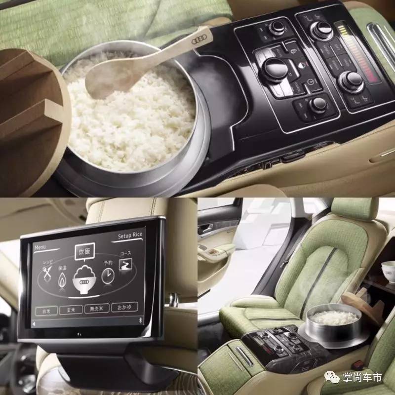 你以为,车里泡茶就够异想天开了?nonono,奥迪更厉害,还能能在车上煮饭呢! 奥迪曾经为日本消费者在A8 5.5特别版车型中,设计了一个电饭煲。 据奥迪官方介绍,这个设计是为了向日本的稻米饮食文化致敬,在后排的中央扶手箱中是一个宽边的电饭煲。后排的乘客可以通过后排的触屏来选择自己喜欢的口味。 为了迎合家的氛围,座椅也从真皮材质改为了类似于榻榻米的材料。看上去是那么的美好,不过,这款车型消息的公布时间为:4月1日。
