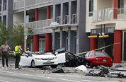 当地时间2014年7月4日,美国西好莱坞,一处街道由于发生车祸而封锁,几辆车互相追赶,一辆特斯拉汽车撞进了一面墙内,造成数人受伤。