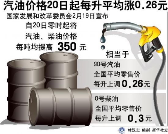 ![]() 国家发展和改革委员会19日宣布,自20日零时起将汽油、柴油价格每吨均提高350元,相当于90号汽油全国平均零售价每升上调0.26元,0号柴油全国平均每升上调0.3元,涨幅为4.5%。 发展改革委价格司司长曹长庆说,去年12月22日上调国内成品油价格以来,国际市场原油价格持续震荡上扬。1月22日,国际市场原油连续22个工作日移动平均价格超过4%,按照现行成品油价格形成机制,应适当上调国内成品油价格,但考虑当时的物价形势、春节以及成品油市场供求状况,国家适当推迟了提价时间,控制了提价幅度。 据了解,如不控制提价幅度,按现行成品油价格形成机制,这次油价涨幅约为10%。国家已要求中石油、中石化发挥企业内部上下游利益调节机制作用,自行部分消化原油价格上涨压力,补贴炼油企业。 发展改革委价格司副司长刘振秋表示,这次油价调整后,国家将按照现行的成品油价格调整对公益行业补贴机制,继续对种粮农民、渔业、林业、城市公交、农村道路客运给予补贴,对出租车行业给予临时补贴;继续做好城乡低保对象等困难群体基本生活保障工作。(江国成) |