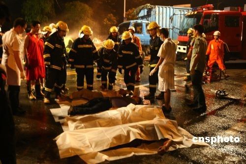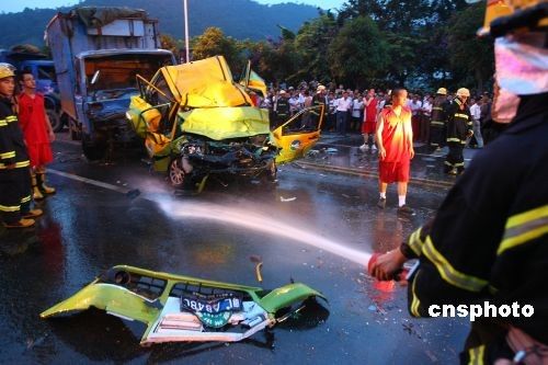记者18时40分左右赶到事故最为严重的鳄湖路,肇事巴士已停在道路中央,肇事司机李国清已被抓获归案。现场一片狼藉,距离该巴士20多米处,一辆出租车被前后夹击,面目全非,车上4人当场死亡。交警、消防、公安等部门正在紧张处理事故现场。