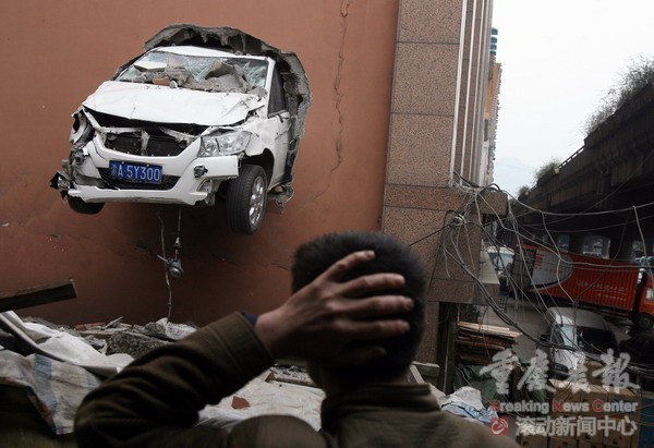 3月1日早上9点左右,重庆渝中区长滨路南滨大厦发生一起离奇车祸,一辆轿车在室内停车场行驶时失控,撞破停车场厚厚一层墙壁,半截车身悬在室外7、8米高空,幸运的是,车上人员无大碍。
