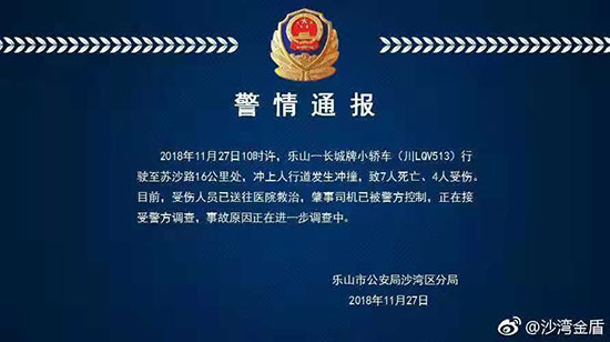 11月27日电 (李平 王洪江)11月27日,记者从四川省乐山市公安局获悉,今日上午10时许,乐山一小轿车(川LQV5**)行驶至苏沙路16公里处,冲上行人道发生冲撞,致7人死亡,4人受伤。目前,受伤人员已送往医院救治,肇事司机已被警方控制,事故原因正在进一步调查中。