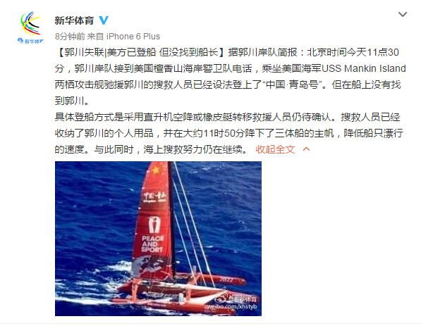 据新华体育微博消息:北京时间今天11点30分,郭川岸队接到美国檀香山海岸警卫队电话,乘坐美国海军USS Mankin Island两栖攻击舰驰援郭川的搜救人员已经设法登上了“中国·青岛号”。但在船上没有找到郭川。 具体登船方式是采用直升机空降或橡皮艇转移救援人员仍待确认。搜救人员已经收纳了郭川的个人用品,并在大约11时50分降下了三体船的主帆,降低船只漂行的速度。与此同时,海上搜救努力仍在继续。 |