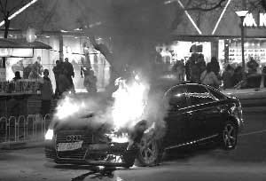 去年12月17日晚,被王烁倒车撞坏的王珂军牌奥迪在马路上起火燃烧 资料图片