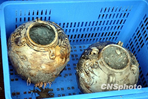 2010年5月16日,广东汕头,明代沉船南澳一号青花瓷大盘等一批瓷器文物被清理出水。
