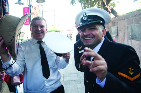 在栈桥,很多市民看到外国水兵后,争相拿出照相机与他们合影。而水兵们对市民、游客们的要求大多来者不拒,只要有要求合影的,水兵们都非常配合地停下脚步,摆出各种拍照的姿势。记者 杨宁 胡希平 张潇元