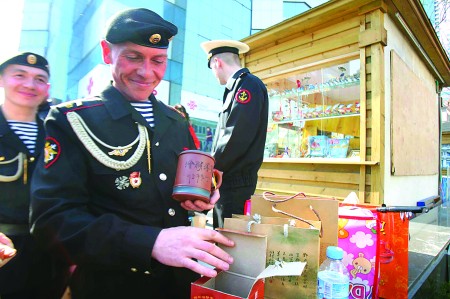 左一个大包右一个小包,俄罗斯水兵趁着空闲在岛城忙着开心购物。胡希平 摄