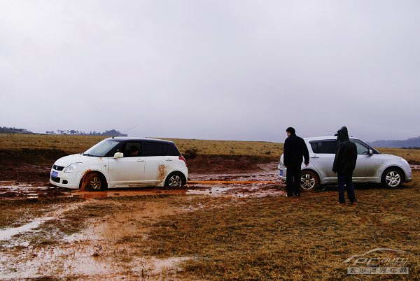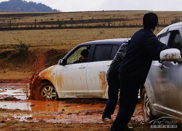 在一个泥泞的道路上,车队遇到了打滑,最后两部车陷到泥地里,翻遍各车后备箱也没找到工兵铲,好在找到一根拖车绳,人拉车拖最后离开困境