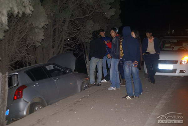 一次八车出游,归途已是夜晚,在一个弯道一部车辆应急躲避路面异常不幸失误掉落路边,出现单方事故,处理事故过程中其它打开大灯照明车辆的电瓶耗干导致其它两部车无法启动,最后用电瓶借电的办法启动。