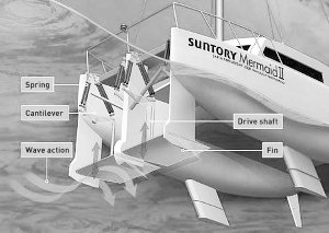 值得一提的是,“美人鱼2号”在行进过程中完全不耗用燃料,而是将波浪的运动能量转成前进动力。原来,船体下方并排安装着一左一右两块叶片。海浪的涌动,或是船体的摇晃,都能使叶片向上或向下旋动。这时,船尾一个简单的弹簧系统就将能量积聚起来。积聚到一定程度,叶片就会作出类似于海豚尾鳍划水的动作,推动船向前移动。