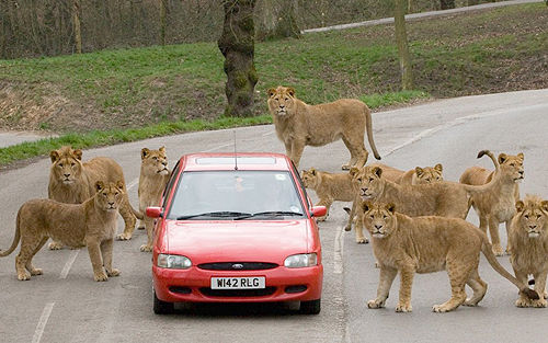 英国游客驾车遭十余头狮子围观 被迫停车