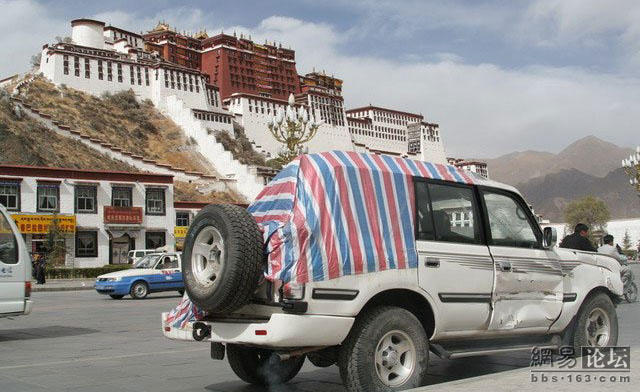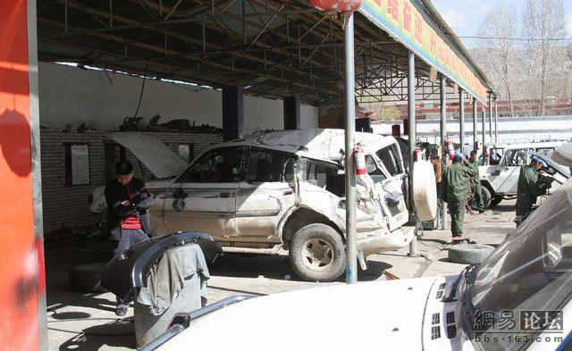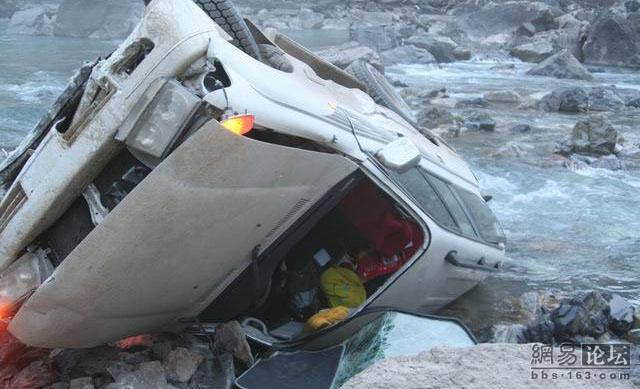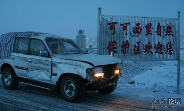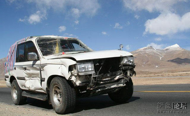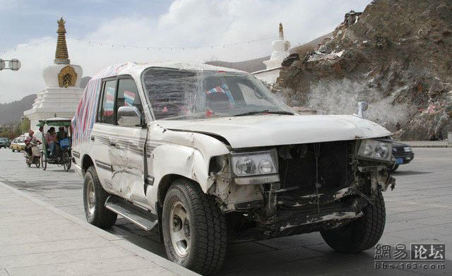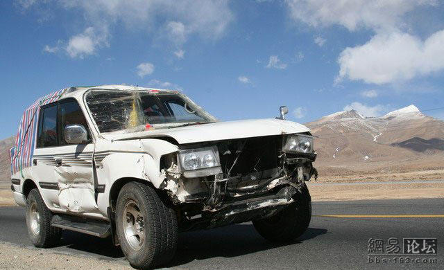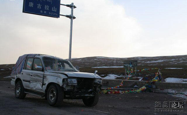 这位老兄刚买了一辆二驱的富奇,没上牌就上西藏,没想到来了个真实的碰撞,由于车内四面透风,所以车主全副武装.由于车破不让上高速走的全部是省道.