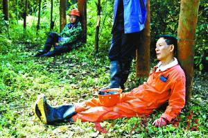 奋战两昼夜之后,救援人员再也撑不住了,一口气坐到地上,靠着大树休息。记者庄小龙 实习生刘雷摄