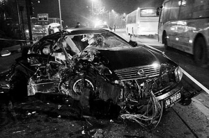 2008年9月15日凌晨4点多,杭州之江路九溪公交车站附近,一辆黑色轿车撞到钱江疗养院门口30厘米厚的石碑,接着,又翻转撞到西面一棵直径约70厘米的大树上,车子断成了两截。车里三个小伙子,两死一伤。幸存者陈某说,当晚“我们先去了吴山广场附近一家酒吧,喝到两点多,去大排档吃东西,又接着喝。车速估计七八十码吧”。