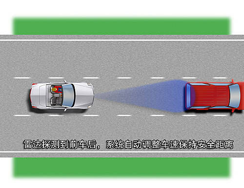 在驾驶过程中,驾驶者设定所希望的车速,系统利用低功率雷达或红外线光束得到前车的确切位置,如果发现前车减速,系统就会发送执行信号给发动机或制动系统来降低车速使车辆和前车保持一个安全的行驶距离,当前方道路没车时又会加速恢复到设定的车速。由于车辆不仅仅在直线行使,也要考虑在弯道中的使用。在多车道公路上行驶时,系统根据方向盘转动的角度可以识别自己所在车道上的车辆和相邻车道的车辆,避免出现错误判断。